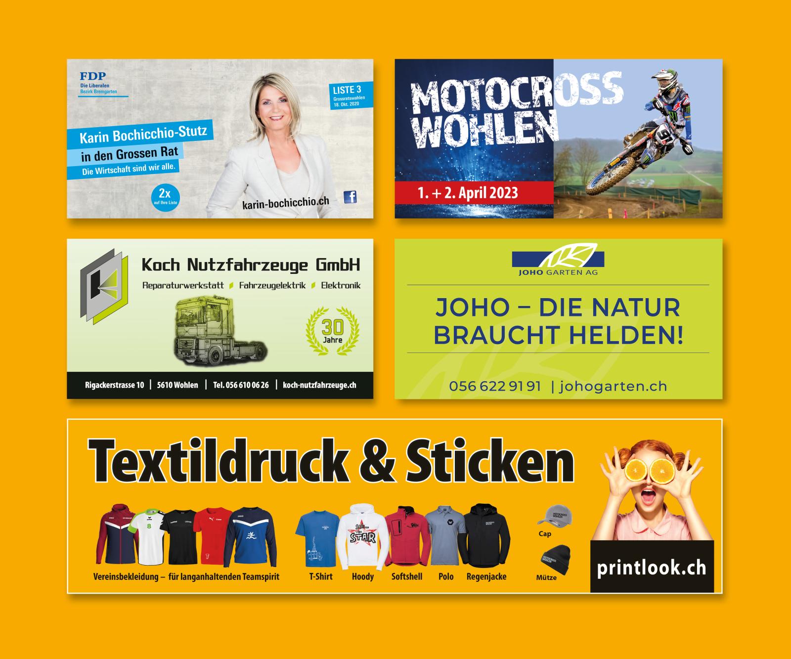 Werbebanner oder bedruckte Platten fertigen wir in langanhaltender, wetterbeständiger Qualität.